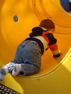 In other news, Reed and I were able to go to the park a few times already! Yeah! We both love being outside, and it's a place where Reed can practice going up and down stairs (since we don't have any). We have a little park right by our house, which is way fun. Reed loves the slide, the stairs, and the wood chips :) He could stay for hours probably, if he didn't get hungry. We also went to a park near a friend's house that had swings! Reed thought the swings were so much fun! Again, if he never had to eat, he would have stayed all day long!